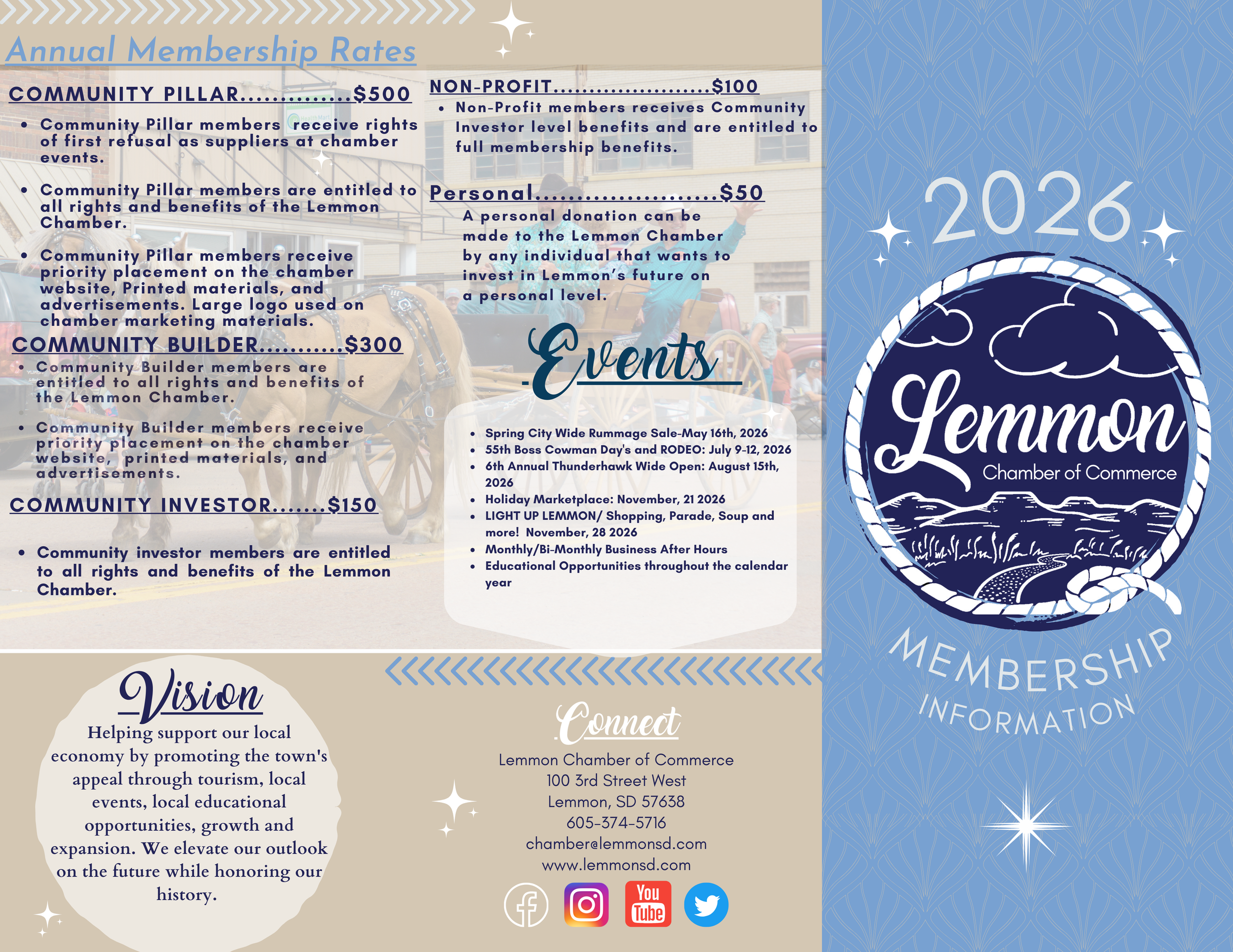 Here at the Lemmon Chamber of Commerce, we look forward to supporting and providing a service to our important local businesses. We have a unique town with many amenities that cover every need you could want, in any size town.