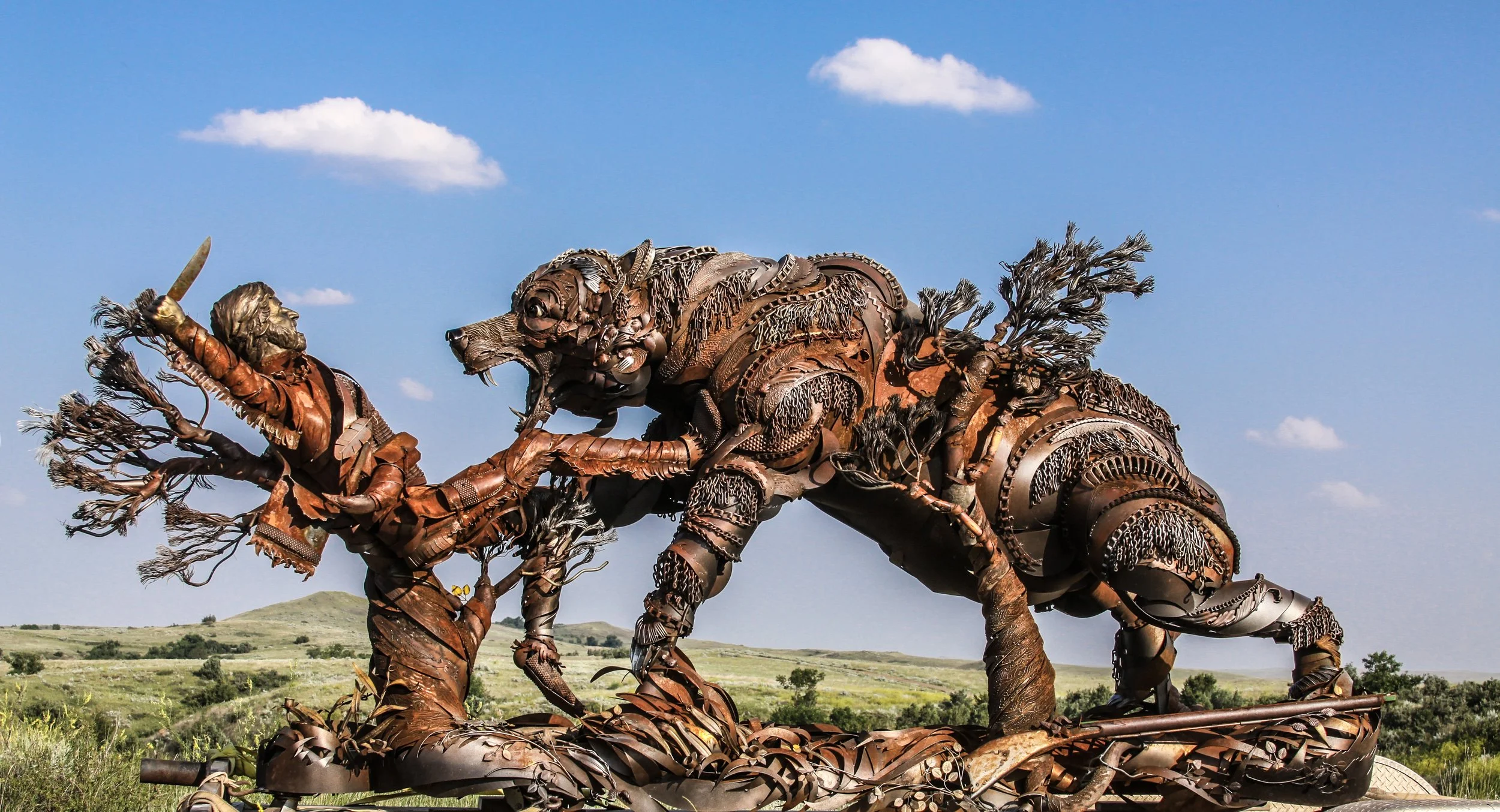 Sculpted by local artist John Lopez, the sculpture features many items unique to town founder, G.E. "Dad" Lemmon and Lemmon itself. Incorporated into it, you can find horseshoes, spurs, knife, Army Colt .45 pistol, a bronze long horn head and many other memorabilia items from the local community.